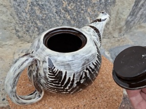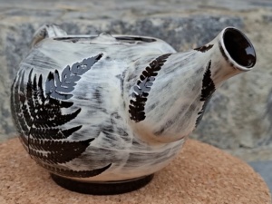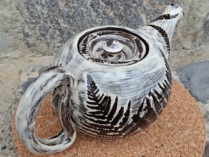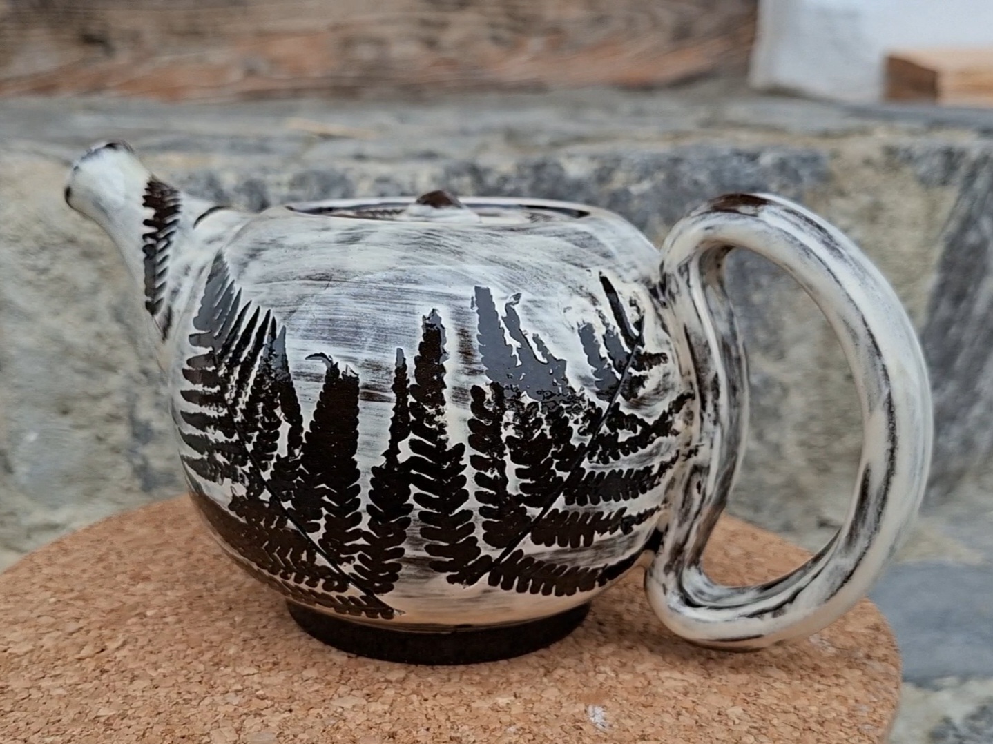 Pour cette théière, la nature a participé. Des feuilles de fougère fraîches ont été imprimées dans l’argile. Avant de les retirer, j’ai ajouté de l’argile blanche afin de révéler le contour et le relief des feuilles. Cette méthode vous permet maintenant de sentir, sous vos doigts, les feuilles de fougère.